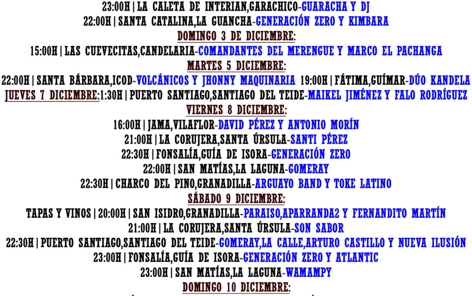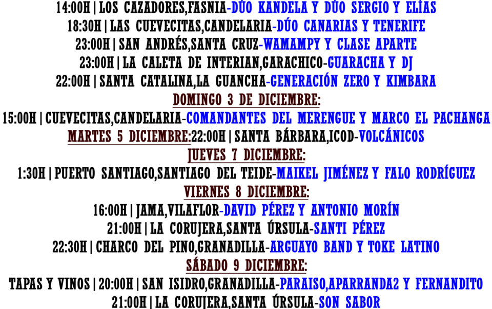 Bueno con esta agenda cierro este 2023… en el caso de que haya muchos aplazamientos por fenómenos meteorológicos como caso excepcional lanzaré otra agenda. Queda la de fin de año…Canal de whatssap: https://whatsapp.com/channel/0029Va8nc2A77qVZokI0aC2K #tenerife #tenerifelicidad #canarias #islascanarias #canaryislands #verbenas #quesuerteviviraqui […]