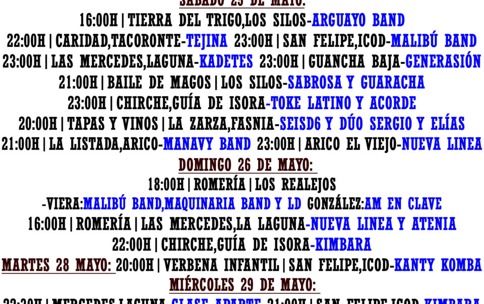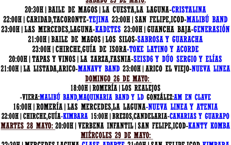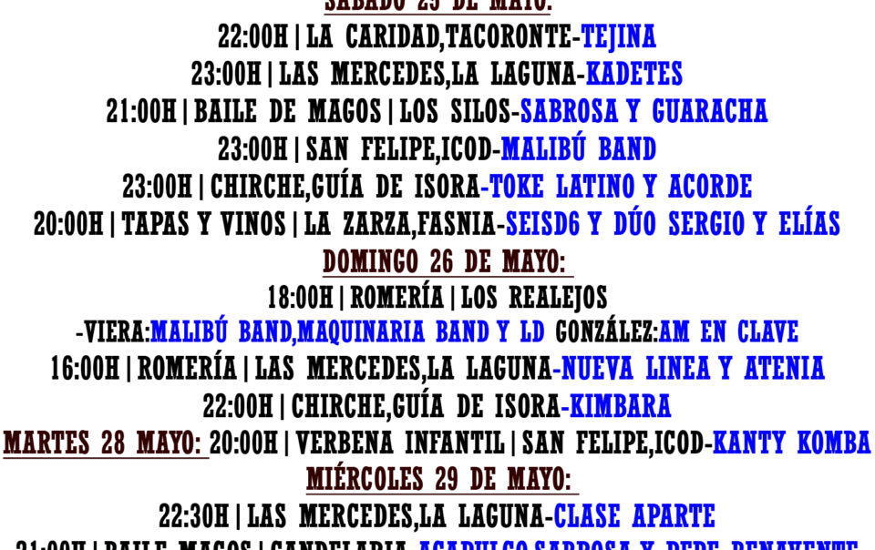 VERBENAS GRANADILLA 2024 – TENERIFE Programa completo:https://www.granadilladeabona.org/wp-content/uploads/2024/05/PROGRAMA-FIESTAS-GRANADILLA-WEB-final.pdf #granadilla #granadilladeabona #tenerife #tenerifelicidad #canarias #islascanarias #romería #romeria #orquestascanarias Source